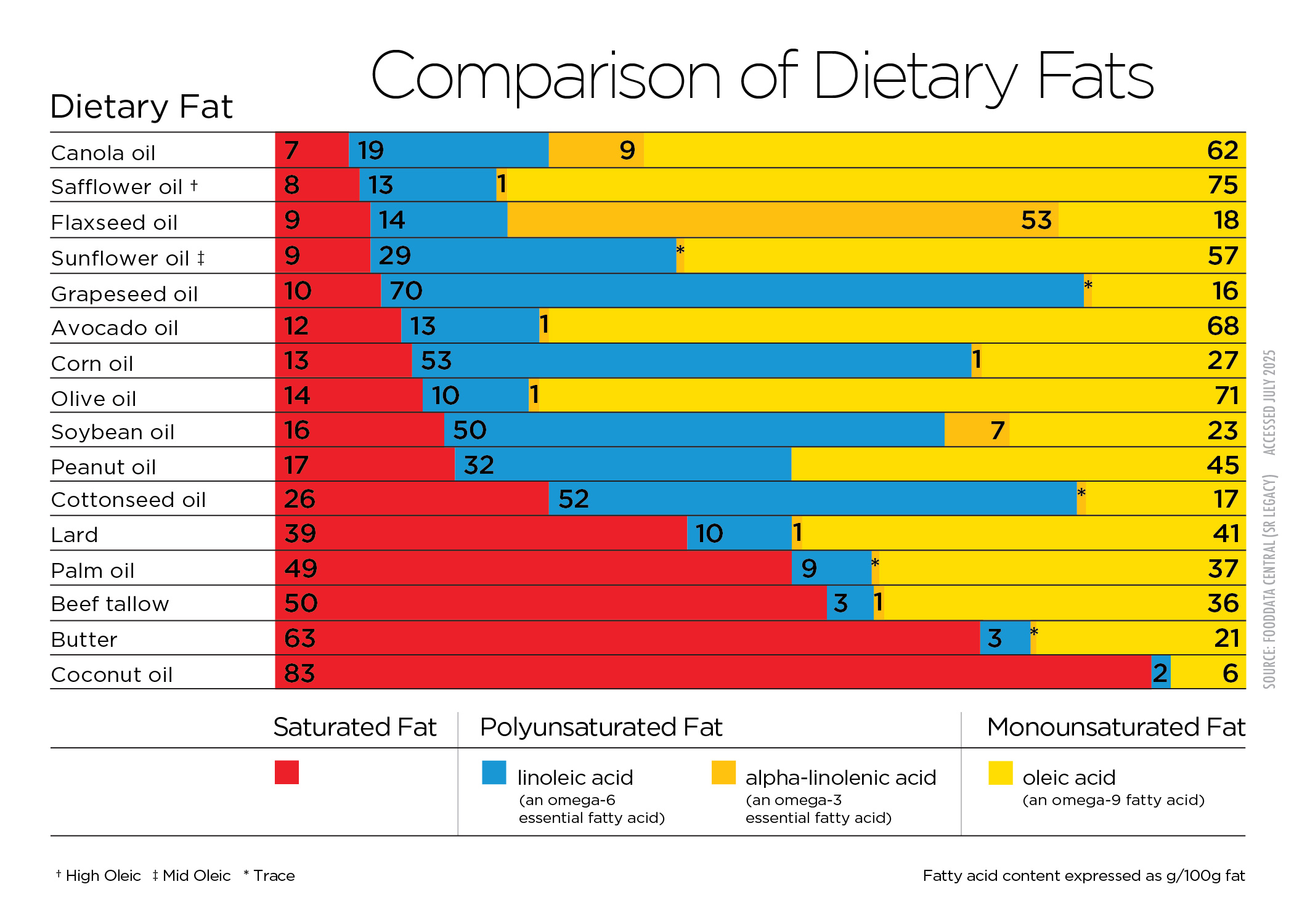 Canola oil has the least amount of saturated fat of all the common cooking oils, is rich in monounsaturated fat, and contains both omega-3 and omega-6 essential polyunsaturated fatty acids.